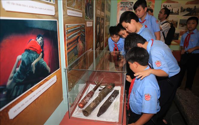 Các em học sinh xem Triển lãm về dấu tích chiến tranh.