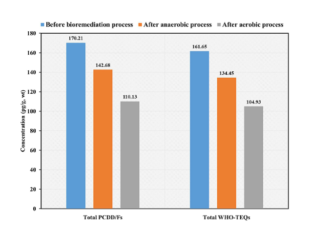 - Kết quả xử lý hiếu khí: Nồng độ ban đầu 50.000pptTEQ sau xử lý là 30.000ppt TEQ đạt hiệu suất 40%.