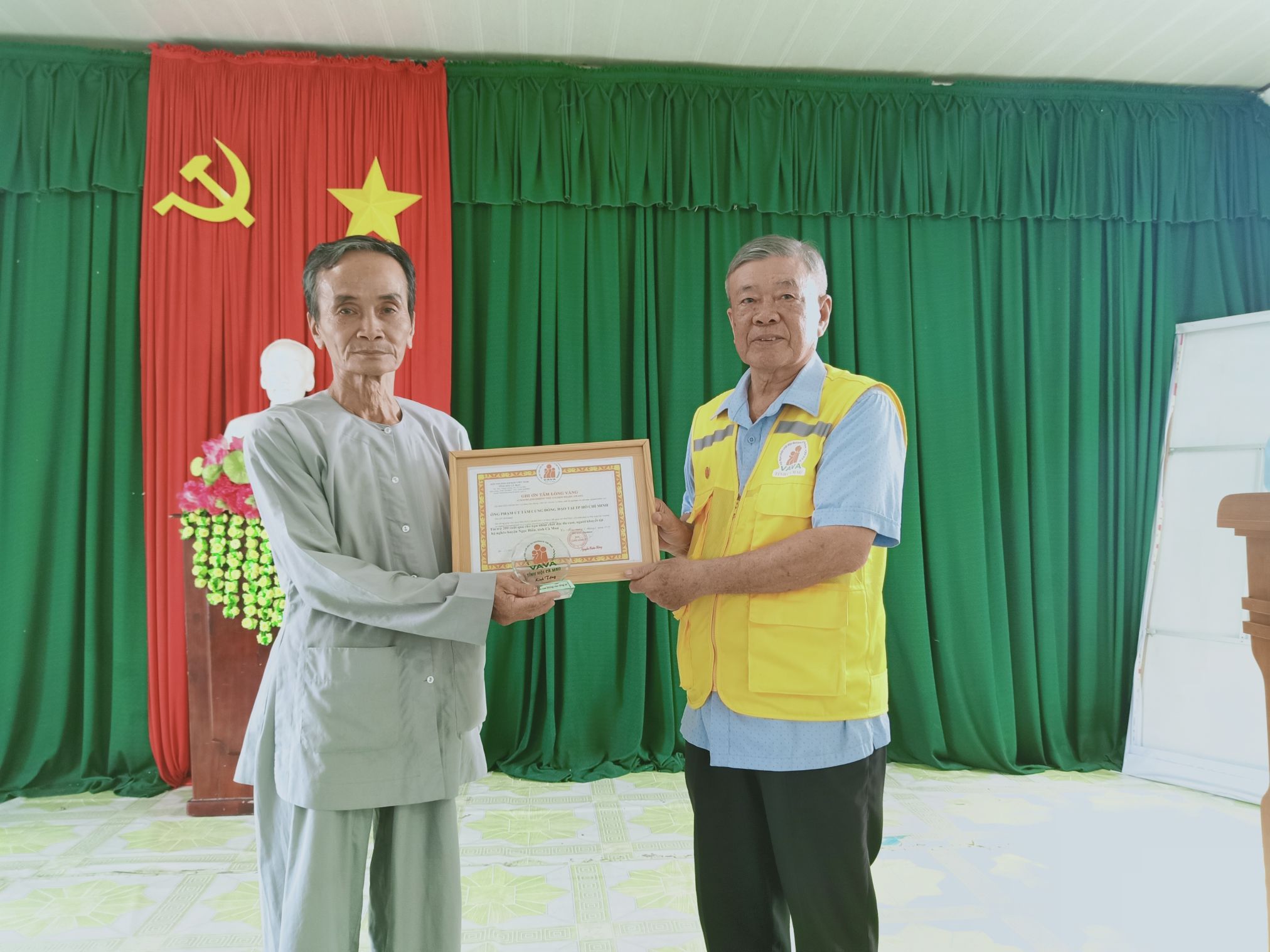 Ông Nguyễn Xuân Hùng, Chủ tịch Hội NNCĐDC tỉnh Cà Mau trao Bằng ghi ơn Tấm lòng vàng cho ông Phạm Văn Tâm