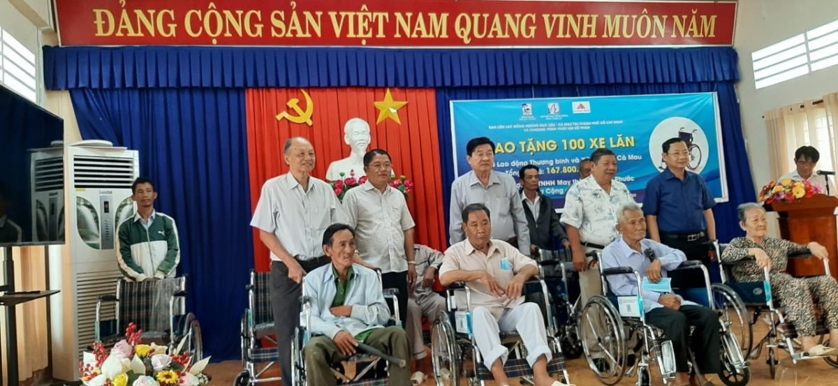 Hội NNCĐDC/dioxin tỉnh Cà Mau thông qua Thiếu tướng Hồ Việt Lắm, Anh hùng lực lượng vũ trang nhân dân, Trưởng ban Liên lạc Đồng hương Bạc Liêu - Cà Mau tại Thành phố Hồ Chí Minh kết nối vận động nhà tài trợ là Công ty TNHH May thêu giày An Phước và Quỹ hỗ trợ cộng đồng Đinh Thiên Lý tài trợ 100 chiếc xe lăn, trị giá 167,8 triệu đồng để trao cho các nạn nhân chất độc da cam có hoàn cảnh khó khăn và bị bệnh liệt chân không đi lại được trên địa bàn tỉnh.