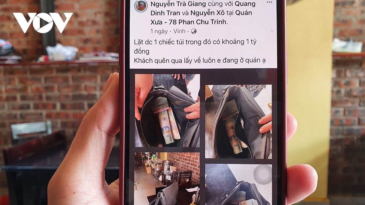 Ngày 12/4, anh Trần Đình Quang (SN 1986, chủ một quán ăn trên đường Phan Chu Trinh, TP Vinh, Nghệ An) cho biết, sau khi xác nhận, anh cùng nhân viên đã trao trả lại chiếc túi bên trong có gần 1 tỷ đồng tiền mặt cho vị khách hàng bỏ quên tại quán.