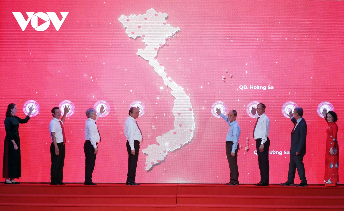 Chủ tịch nước Nguyễn Xuân Phúc và các đại biểu thực hiện nghi thức phát động Tháng Nhân đạo 2022.