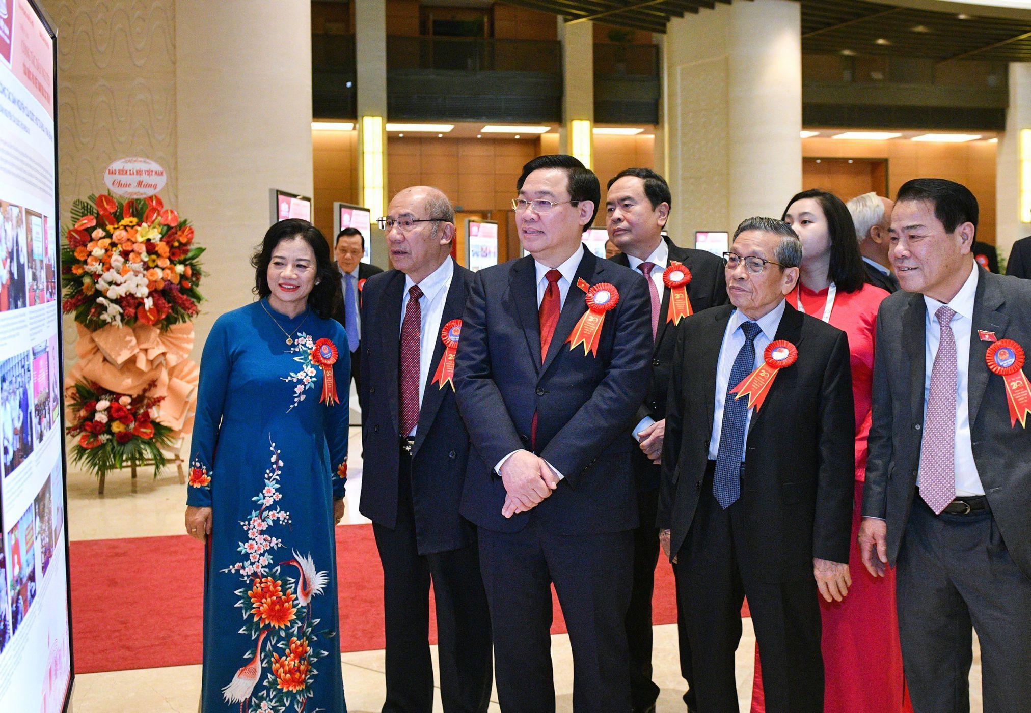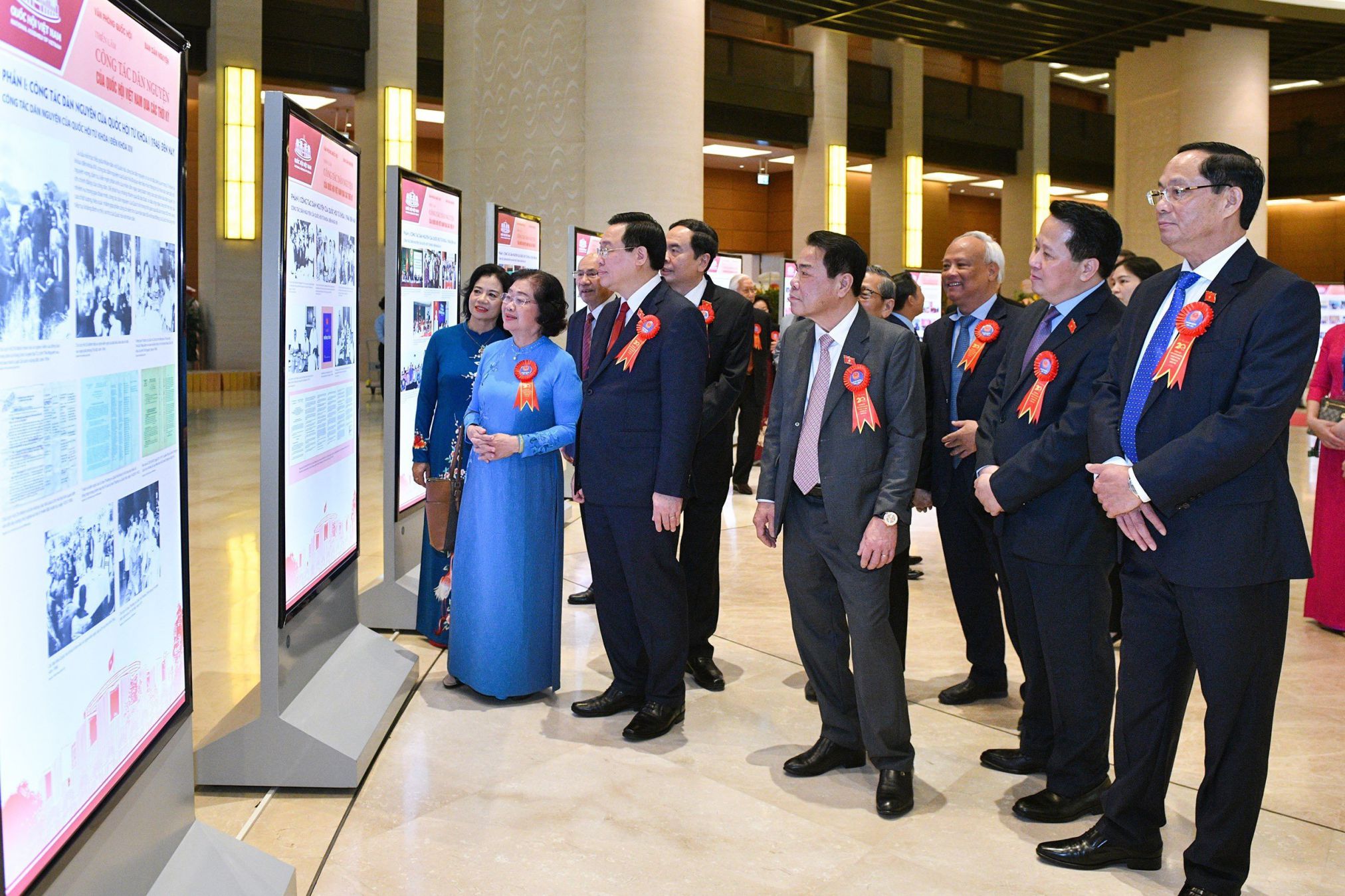 Chủ tịch Quốc hội Vương Đình Huệ và các đại biểu tham quan Triển lãm công tác dân nguyện của Quốc hội Việt Nam qua các thời kỳ.