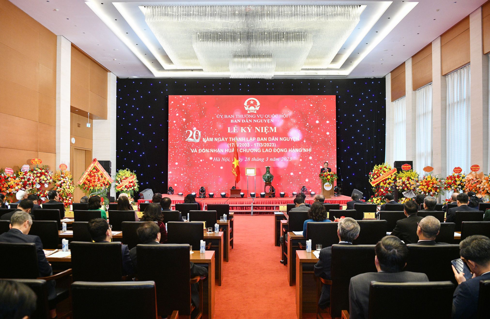 Trước đó, trong diễn văn Kỷ niệm, Trưởng ban Dân nguyện Dương Thanh Bình cho biết, Ban Dân nguyện đã được thành lập theo Nghị quyết số 370/2003/NQ-UBTVQH11 ngày 17/3/2003, của Ủy ban Thường vụ Quốc hội. Trải qua 20 năm hoạt động, công tác dân nguyện đã từng bước đi vào nề nếp, được đổi mới, tăng cường và đạt được những kết quả tích cực. Từ chỗ được giao thực hiện 6 nhóm nhiệm vụ theo Nghị quyết số 370, đến nay Ban Dân nguyện đã được tăng cường thành 9 nhóm nhiệm vụ, trong đó tập trung vào các nhóm nhiệm vụ như: là cơ quan thường trực tiếp công dân của Quốc hội, các cơ quan của Quốc hội; làm đầu mối tiếp nhận, xử lý đơn thư khiếu nại, tố cáo, kiến nghị, phản ánh của công dân; thực hiện việc tiếp nhận, xử lý kiến nghị của cử tri; tham mưu giúp Ủy ban thường vụ quốc hội giám sát công tác tiếp công dân, giải quyết đơn thư khiếu nại tố cáo…