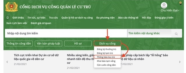 Bước 6: Sau khi đã đăng nhập thành công, người dùng sẽ được điều hướng về lại với Cổng dịch vụ công quản lý cư trú. Tại đây, hãy nhấn vào Dịch vụ công, sau đó chọn Thông báo lưu trú.