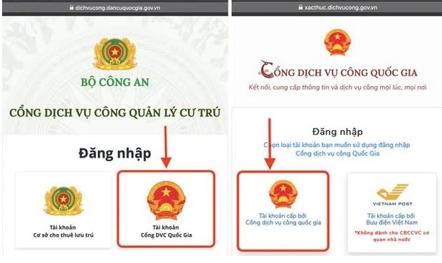 Bước 3: Chọn tiếp Tài khoản Cổng dịch vụ công Quốc Gia ở cửa sổ tiếp theo. Sau khi được điều hướng đến trang xác thực của Cổng dịch vụ công Quốc Gia, nhấn chọn tiếp Tài khoản cấp bởi Cổng dịch vụ công quốc gia.