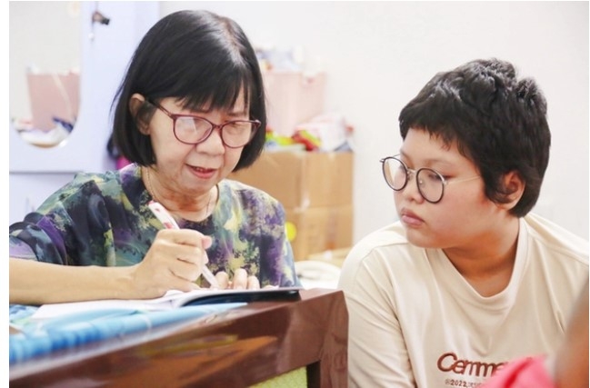 Trong một góc trọ gần BV Ung bướu TP.HCM, tiếng í ới đánh vần, đọc chữ của những đứa trẻ chốc chốc lại vang lên. Cặm cụi sửa từng lỗi sai chính tả, dạy từng bài toán, chốc chốc cô Đinh Thị Kim Phấn (66 tuổi) lại ngước lên nhìn đám học trò đặc biệt của mình, trìu mến.