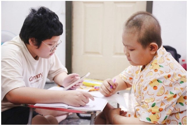 Nắn nót viết từng chữ thật đẹp, Khánh Hồng (12 tuổi) nhìn về phía cô Phấn, tự hào khoe bài văn mới hoàn thành. Cũng giống như những đứa trẻ khác ở lớp học chữ của cô Phấn, từ năm 4 tuổi, Khánh Hồng đã phải vào viện vì căn bệnh ung thư máu quái ác.