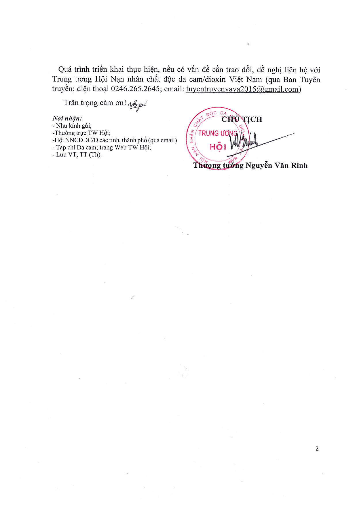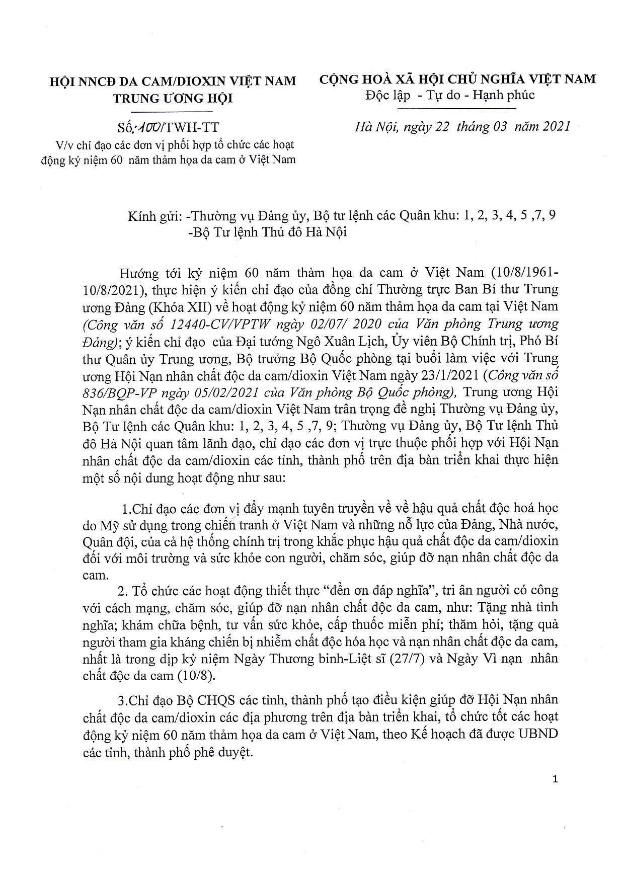 Công văn số 100/TWH-TT về việc chỉ đạo các đơn vị phối hợp tổ chức các hoạt động kỷ niệm 60 năm thảm họa da cam ở Việt Nam