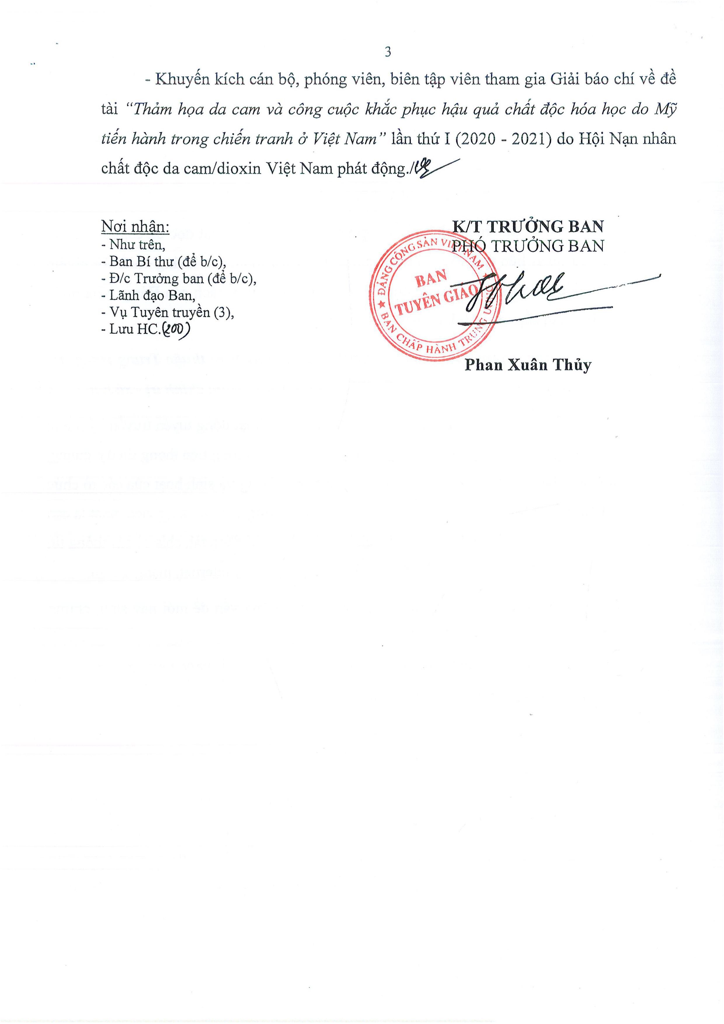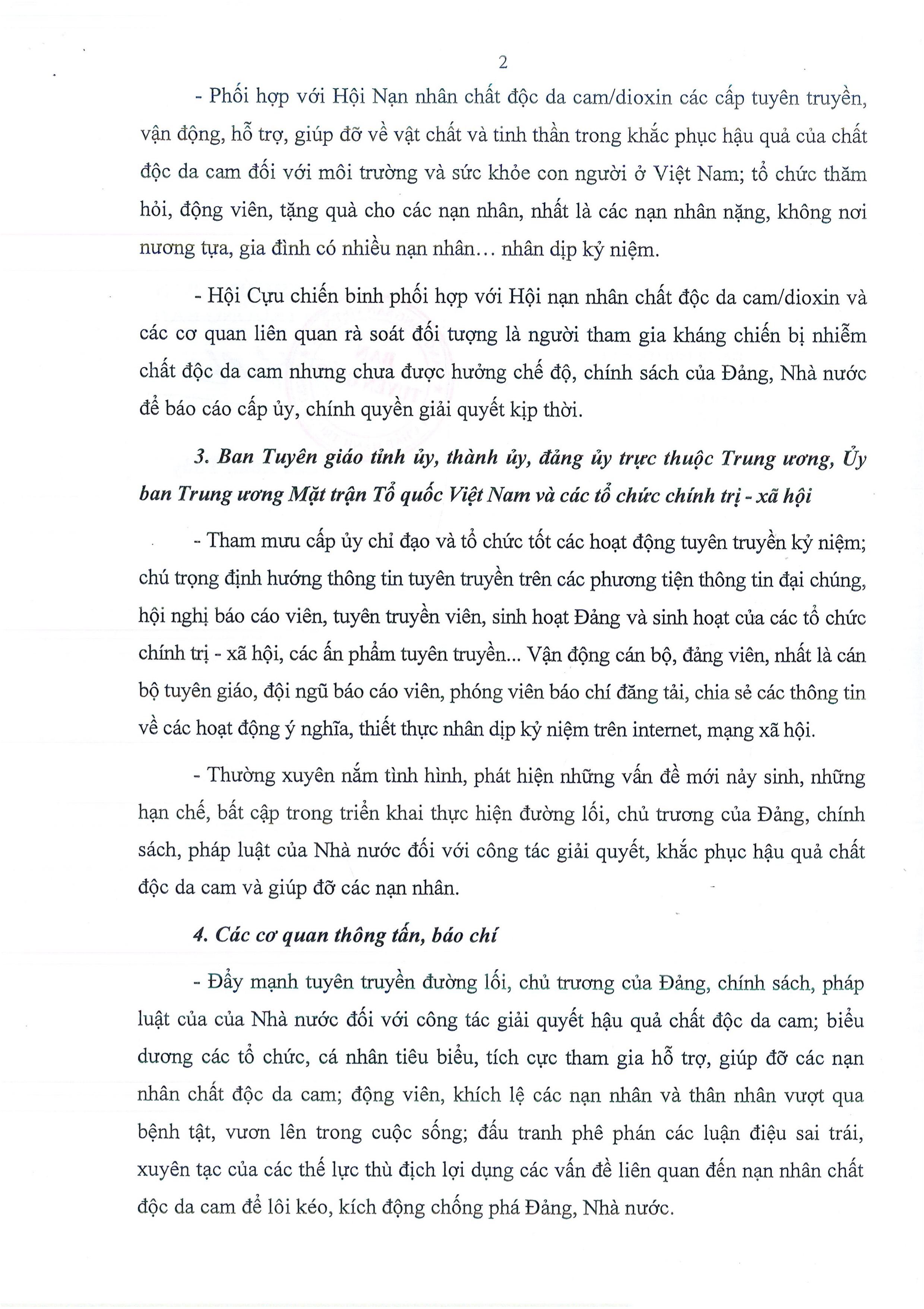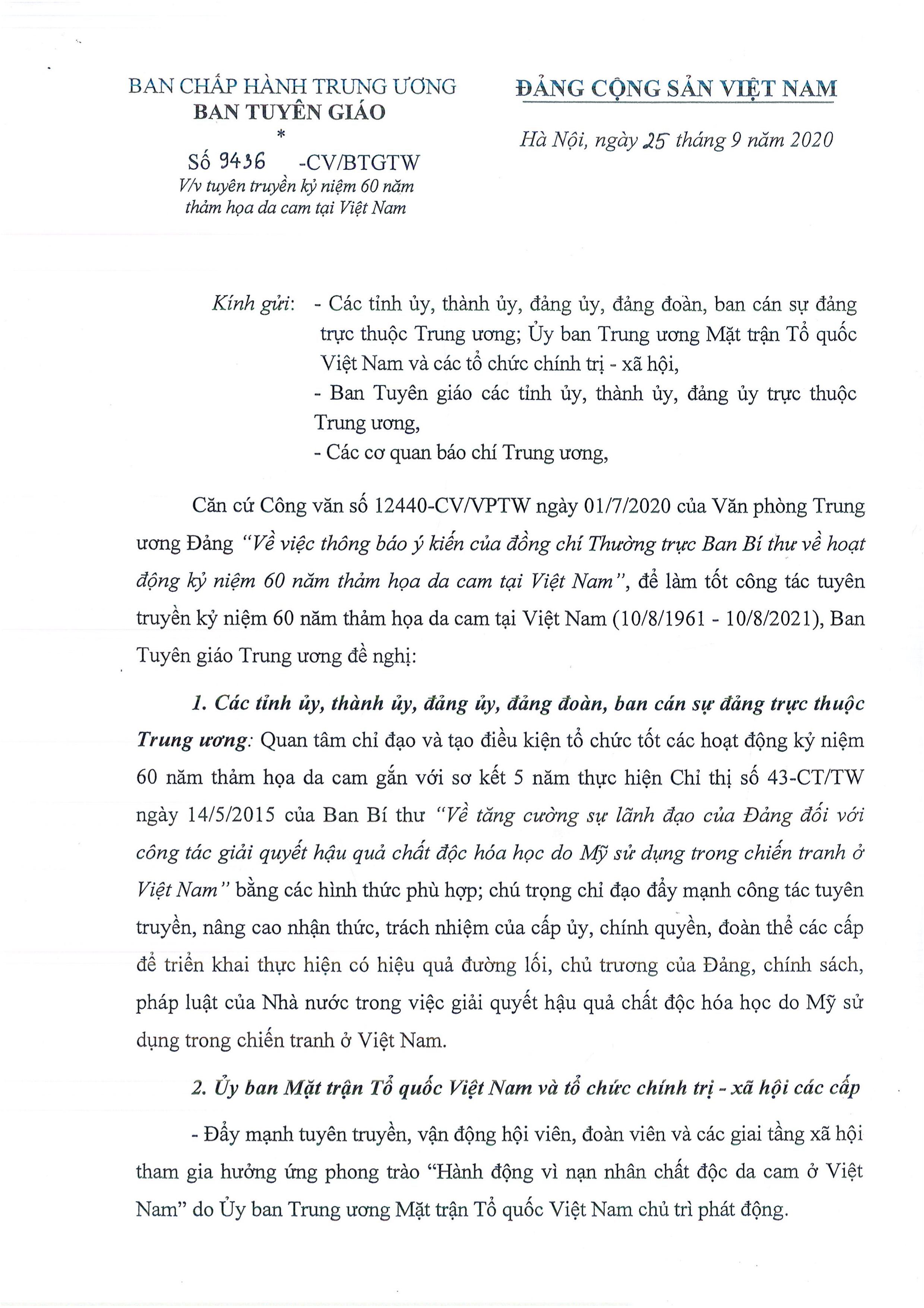 Công văn số 9436-CV/BTGTW của Ban Tuyên giáo Trung ương về việc Tuyên truyền kỷ niệm 60 Thảm hoạ da cam tại Việt Nam