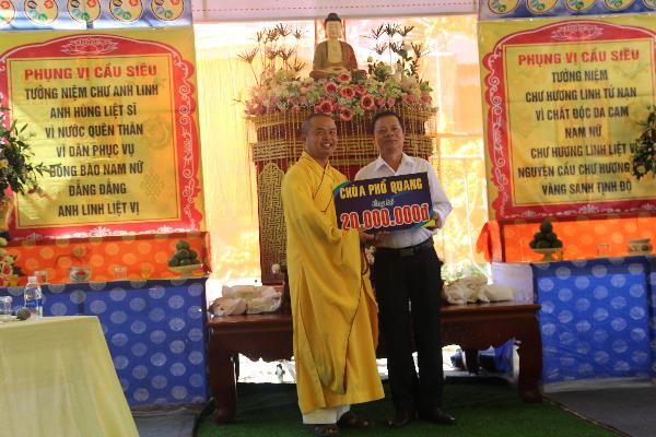 Đại đức Thích Huệ Trí, trú trì Chùa Phổ Quang trao tiền ủng hộ NNCĐDC