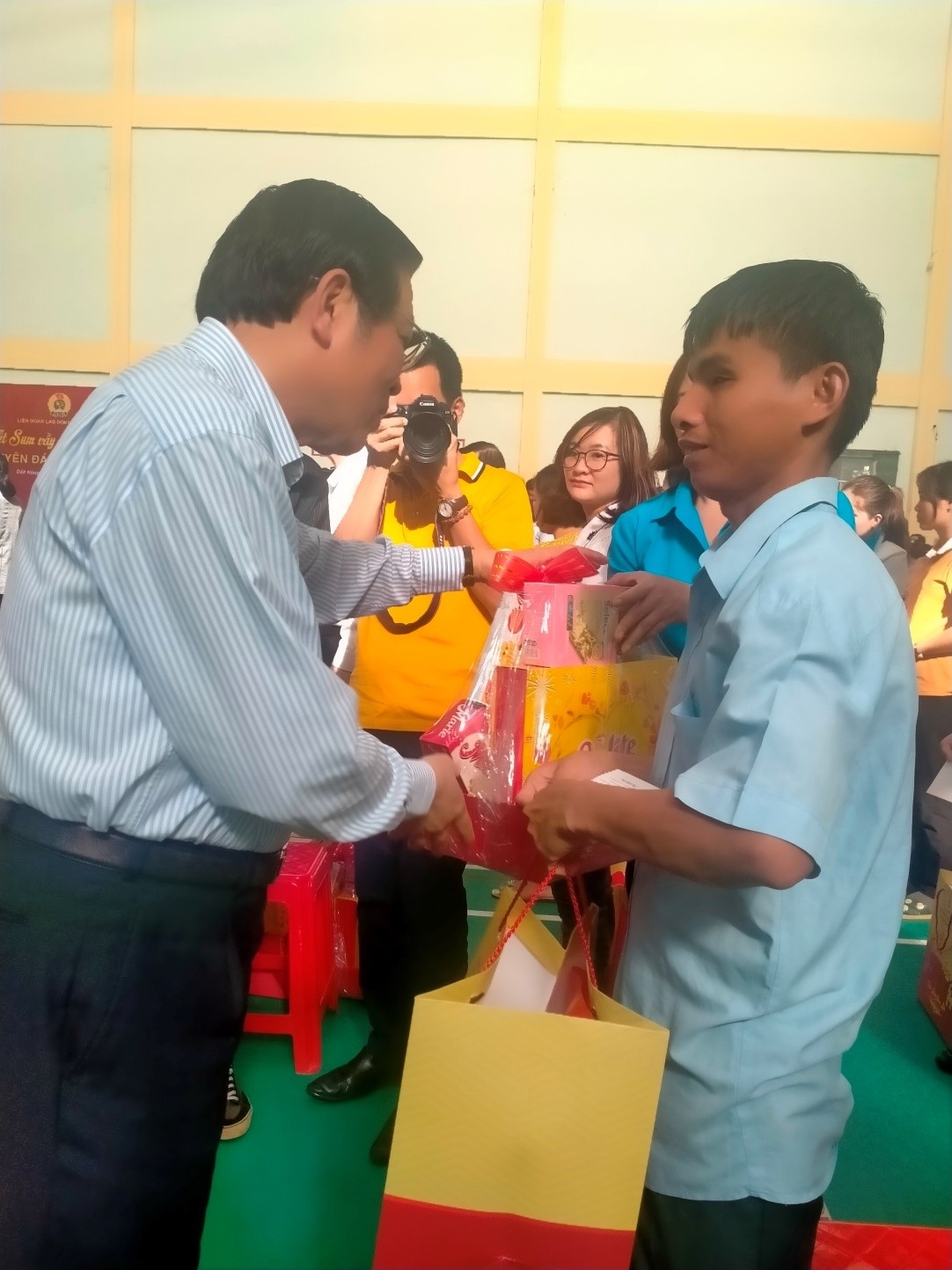 Đồng chí Phan Đình Trạc, Ủy viên Bộ Chính trị, Bí thư Trung ương Đảng - Trưởng Ban Nội chính Trung ương về thăm, làm việc và tặng quà anh Nguyễn Văn Giới (dân tộc Tày) là nạn nhân chất độc da cam bị khiếm thị đang làm việc ở Hội Người mù tỉnh Đắk Nông
