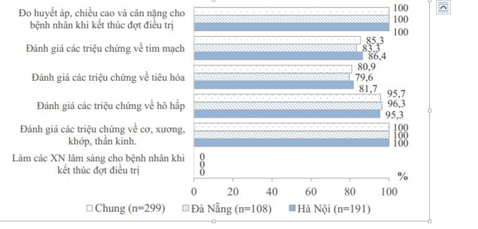 Sau điều trị không có bệnh nhân nào được làm các xét nghiệm lâm sàng trong nghiên cứu này. Trong khi đó kết quả tỷ lệ này trong các nghiên cứu tại bệnh viện Quân y 103, TTTĐ Hà Tĩnh và Thái Bình đều đạt 100% [4], [7], [9]. Sự khác biệt này là do các nghiên cứu khác được thiết kế đánh giá hiệu quả can thiệp, phương pháp XHGĐ đặc hiệu hoặc theo dõi hiệu quả điều trị trong một thời gian dài nên các tác giả tập trung vào đánh giá các chỉ số lâm sàng của bệnh nhân trước và sau can thiệp. Đặc biệt là các nghiên cứu tại Bệnh viên Quân y 103 được tiến hành trên cỡ mẫu nhỏ (34 và 35 bệnh nhân) và đo lường các chỉ số lâm sàng như hoạt độ enzym ALT, GGT, nồng độ protein máu [7]. Nghiên cứu ở Thái Bình tiến hành theo dõi 820 bệnh nhân điều trị bằng phương pháp XHGĐ theo đợt trong thời gian 2 năm, mỗi đợt gồm 28-32 bệnh nhân [4]. Tuy nhiên đây là một nghiên cứu được tài trợ, kinh phí lớn nhằm đánh giá hiệu quả điều trị của phương pháp thanh lọc độc tố Hubbard trước khi nhân rộng. Do đó yêu cầu bắt buộc trong bước phân loại bệnh nhân là làm các xét nghiệm lâm sàng trước khi tham gia điều trị. Trong khi đó nghiên cứu này là một nghiên cứu cắt ngang, tập trung kiểm kê bệnh án của bệnh nhân để đánh giá thực hiện QTXHGĐ Hubbard. Bên cạnh đó, tại TTTĐ Hà Nội quá trình phân loại bệnh nhân được đánh giá dựa vào kết quả khám sức khỏe bệnh nhân vào thời điểm gần nhất. Do vậy hầu hết các bệnh nhân tham gia các đợt XHGĐ trong 06 tháng đầu năm tại đây đều không được làm các xét nghiệm lâm sàng trước khi đăng ký tham gia 21 ngày điều trị.