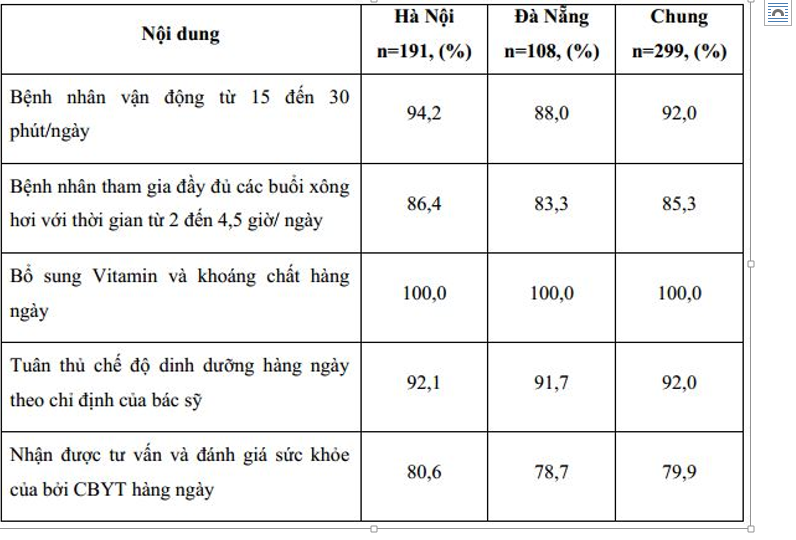 Bảng 2. Thực hiện vận động, xông hơi, bổ sung chất dinh dưỡng, và nhận tư vấn, đánh giá sức khỏe từ bác sỹ hàng ngày của bệnh nhân tham gia nghiên cứu theo QTXHTĐ Hubbard