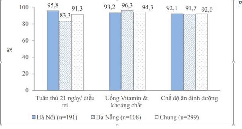 Kết quả theo dõi sau điều trị cho thấy, đa số (91%) bệnh nhân đã tham gia đủ 21 ngày/ đợt điều trị theo đúng QTXHGĐ Hubbard tại 02 TTTĐ. Trong đó, tỷ lệ này tại Hà Nội (n=191) Đà Nẵng (n=108) Chung (n=299) Hà Nội (96%) cao hơn Đà Nẵng (83%). Điều này có thể do thời gian thực hiện quy trình dài nên đã có một số bệnh nhân không đủ điều kiện tham gia điều trị. Do vậy cần tối ưu hóa thời gian thực hiện QTXHGĐ Hubbard tạo điều kiện thuận lợi cho bệnh nhân có thể tham gia đầy đủ, bên cạnh đó cần giải thích cho bệnh nhân hiểu về thời gian điều trị của quy trình. Tỷ lệ bệnh nhân tuân thủ uống thuốc và thực hiện chế độ ăn giàu dinh dưỡng hàng ngày là tương đương giữa 2 TTTĐ Hà Nội và Đà Nẵng: 93% với 96% và 92% với 92%. Việc tuân thủ chế độ dinh dưỡng và giảm dần thuốc sau điều trị giúp tăng cường và duy trì tình trạng sức khỏe sau điều trị.