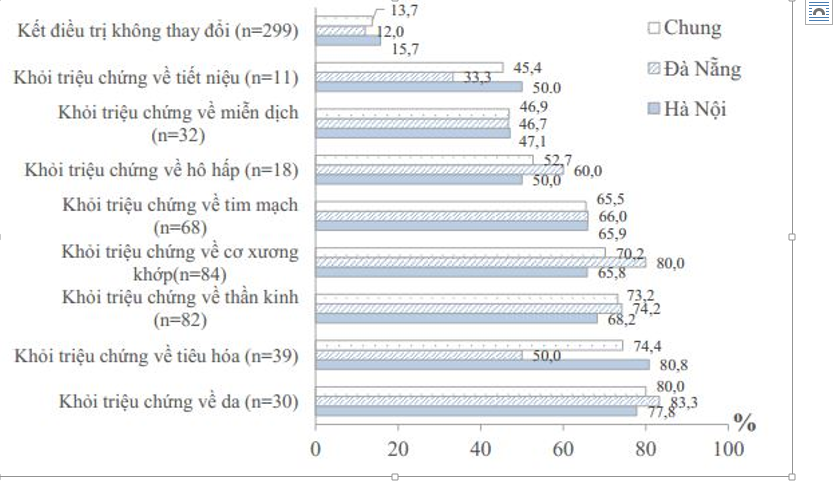 Về hiệu quả của đợt điều trị XHGĐ Hubbard với bệnh nhân cho thấy các bệnh về da; bệnh về thần kinh; bệnh cơ xương khớp; bệnh tiêu hóa; bệnh tim mạch cải thiện tốt các triệu chứng với tỷ lệ lần lượt là: 80%; 73,2%; 70,2%; 74,4%và 65,5%. Nhóm bệnh thuộc hệ thận tiết niệu và các cơ quan khác có kết quả cải thiện triệu chứng thấp nhất (45,9%). Kết quả này tương tự như kết quả của tác giả Nguyễn Xuân Hệ, nhóm bệnh thuộc hệ tim mạch 92% tốt, thần kinh tâm thần là 76% [9]. Theo báo cáo của VAVA tỉnh Thái Bình thì nhóm bệnh có tỷ lệ khỏi hoặc giảm triệu chứng tốt nhất là: tê bì chân tay, đau nhức xương khớp, đau đầu mất ngủ, tăng huyết áp [4]. Tỷ lệ bệnh nhân có kết điều trị không thay đổi hoặc cảm thấy mệt mỏi hơn sau khi điều trị là 13,7% (15,7% ở Hà Nội và 12% ở Đà Nẵng). Điều này có thể là do bệnh nhân không tuân thủ chế độ dùng thuốc, dinh dưỡng phù hợp nên bệnh nhân sẽ cảm thấy mệt mỏi khi tham gia xông hơi. Vì vậy cần kiểm soát chặt chẽ chế độ dùng vitamin, chất khoáng đồng thời xây dự ng chế độ vận động và chế độ ăn cụ thể cho phù hợp với từng bệnh nhân.