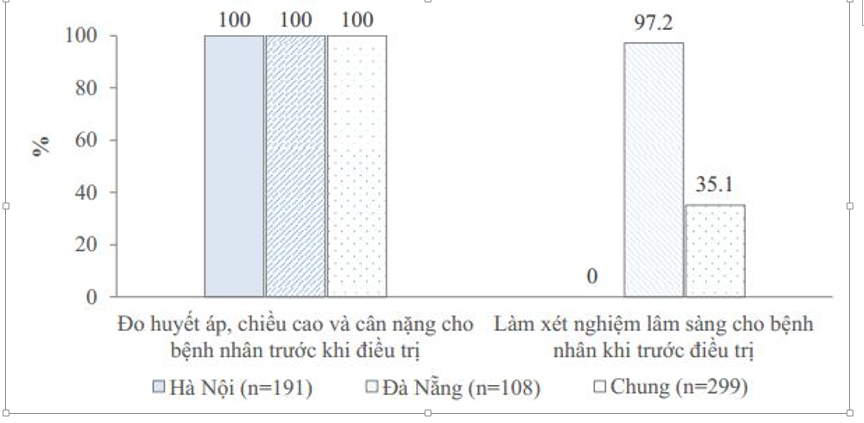 Tỷ lệ bệnh nhân làm các xét nghiêm lâm sàng tại các TTTĐ trong bước 1 khám sàng lọc trước khi quyết định cho bệnh nhân tham gia vào QTXHGĐ Hubbard còn rất thấp khoảng 35% và có sự khác biệt rất lớn về tỷ lệ giữa hai TTTĐ tại Đà Nẵng (97%) và Hà Nội (0%). Nguyên nhân do TTTĐ tại Đà Nẵng tuy chưa có phòng xét nghiệm nhưng lại nằm ở vị trí trung tâm thành phố Đà Nẵng, bệnh nhân dễ dàng được làm xét nghiệm tại các cơ sở khác. Trong khi đó TTTĐ tại Hà Nội chưa có kỹ thuật viên vận hành phòng xét nghiệm. Do vậy các trung tâm cần kiện toàn về nguồn nhân lực cũng như trang thiết bị để thực hiện đầy đủ các bước trong QTXHGĐ Hubbard. Tuy nhiên, về đánh giá các chỉ số cận lâm sàng trước trước điều trị cho thấy 100% bệnh nhân đều được đo huyết áp, chiều cao và cân nặng tại bước phân loại sức khỏe. Một kết quả tương tự như vậy cũng được tìm thấy trong nghiên cứu của Nguyễn Hoàng Thanh, Dương Quang Hiến, Trần Xuân Thu và Phạm Công Nông [4], [6], [7], [8]. Đây là các đánh giá cận lầm sàng tối thiểu mà QTXHGĐ Hubbard yêu cầu tại các nơi cung cấp dịch vụ và thực hiện tương đối dễ dàng.