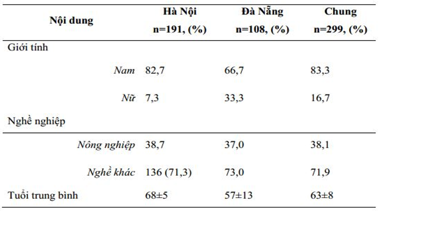 Tuổi trung bình 68±5 57±13 63±8 Nghiên cứu được tiến hành trên các bệnh nhân bị di chứng của chất độc da cam/dioxin có độ tuổi trung bình khá cao (63), dao động từ 50 đến 80 tuổi. Kết quả này tương đương với độ tuổi được tìm thấy trong các nghiên cứu tại Phần Lan, Thái Bình hay Hà Tĩnh [4], [9], [15], [16]. Về giới tính, 80% bệnh nhân tham gia điều trị tại 02 TTTĐ trong 6 tháng đầu năm là nam giới. Tỷ lệ tương đồng cũng được tìm thấy trong hai nghiên cứu tại bệnh viện Quân y 103 tương ứng là 70% và 89% [7]. Liên quan đến nghề nghiệp của bệnh nhân trước khi nghỉ hưu 90% họ làm nghề phi nông nghiệp (quân đội, công chức, dịch vụ). Nghiên cứu của Dương Quang Hiến cũng cho kết quả tương tự với 91% bệnh nhân là quân nhân và 9% làm nghề tự do [8].