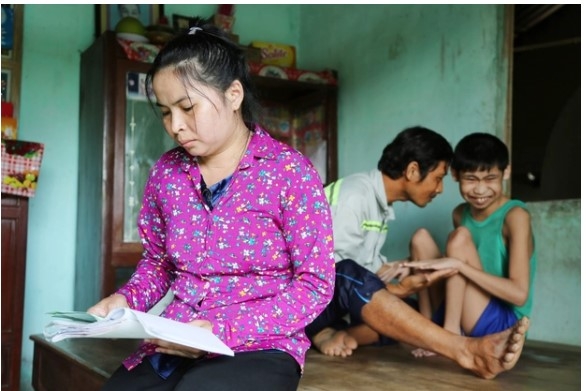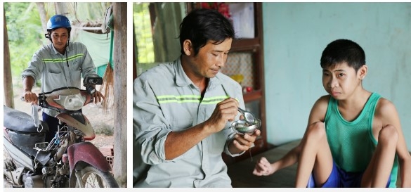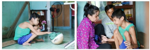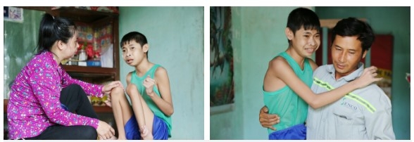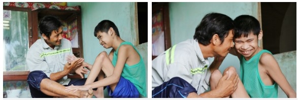 "16 năm rồi nó cứ vậy, chỉ biết ú ớ cười đùa rồi ngồi một chỗ. Anh cũng không biết nó có nhận ra cha, ra mẹ nó không, mình cười thì nó cũng cười", nói đoạn, anh Tới quay về phía chị Trang, buồn bã: "Mẹ nó cũng bệnh nát rồi, anh giờ không biết tính sao nữa".