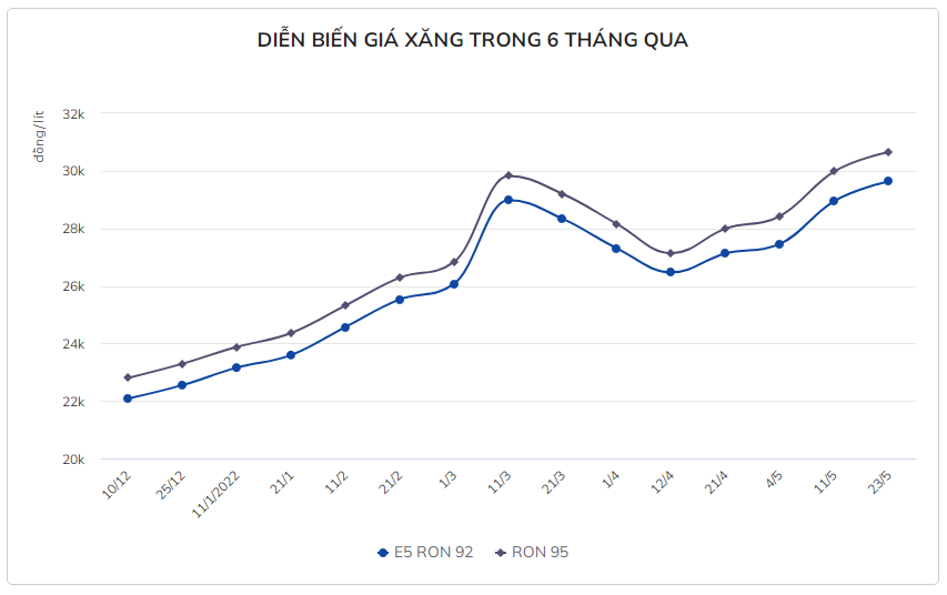 Từ đầu năm 2022 đến nay, giá xăng trong nước đã có 10 lần tăng, tương đương mức tăng 6.741-6.774 đồng/lít, tuỳ loại. Ngày 23/5, giá bán lẻ xăng trong nước tăng thêm gần 700 đồng/lít, đưa giá xăng E5 RON 92 và RON 95 lên mức cao nhất lịch sử là 29.630 đồng/lít và 30.650 đồng/lít.