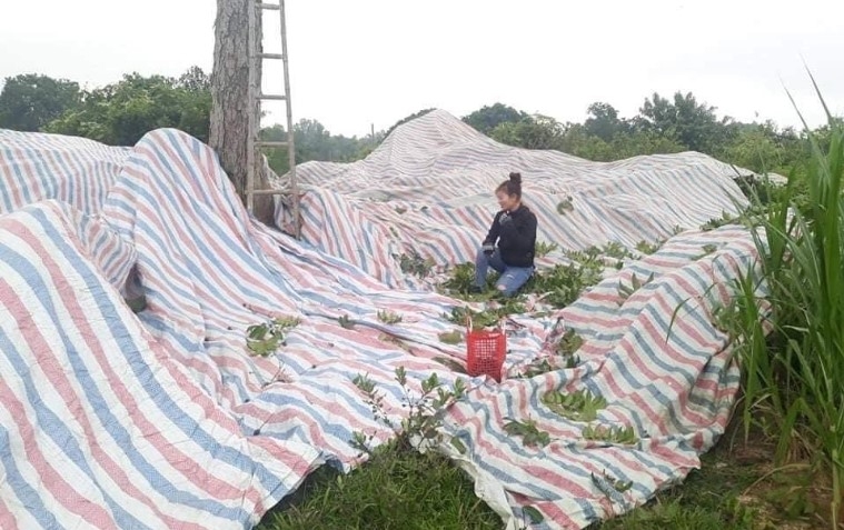 | Người hái trám thuê căng bạt dưới gốc cây để tỉa trám, tránh bị dập nát |