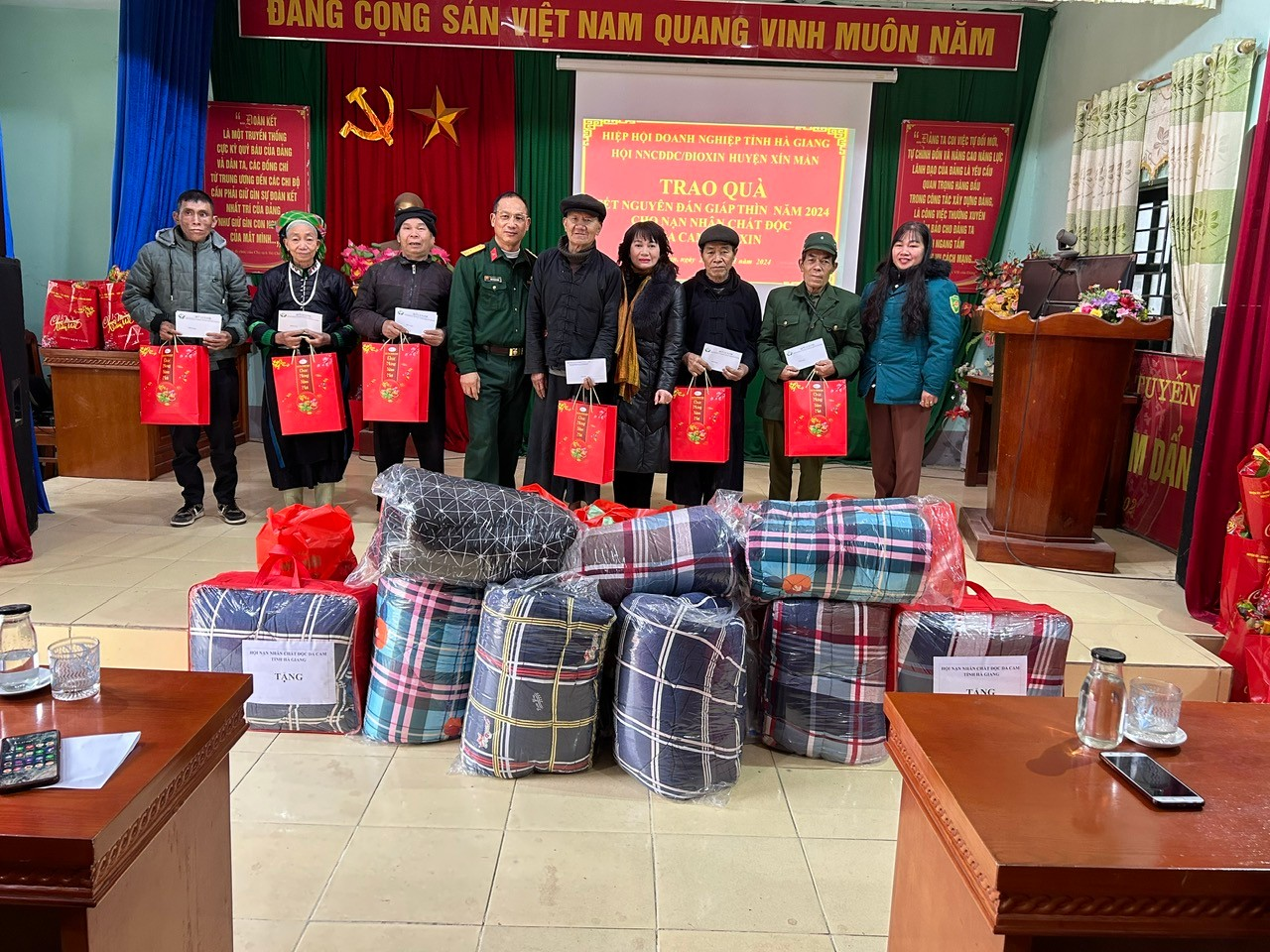 Sáng 29/01/2024, tại Hội trường UBND xã Nấm Dẩn, huyện Xín Mần, tỉnh Hà Giang, đại diện lãnh đạo Hiệp hội Doanh nghiệp tỉnh Hà Giang có bà Nguyễn Thị Lan Dung, Phó Chủ tịch Hiệp hội Doanh nghiệp tỉnh Hà Giang, ông Kiều Thanh Bình, Chủ tịch Hội Nạn nhân chất độc da cam/dioxin huyện Xín Mần, bà Chương Thị Coi, Bí thư Đảng ủy xã Nấm Dẩn cùng dự tặng quà Tết Giáp Thìn 2024, tặng quà cho 20 gia đình nạn nhân chất độc da cam đang được hưởng chế độ trợ cấp hàng tháng, cũng là những gia đình có hoàn cảnh rất khó khăn. Mỗi suất quà trị giá 500.000đ.