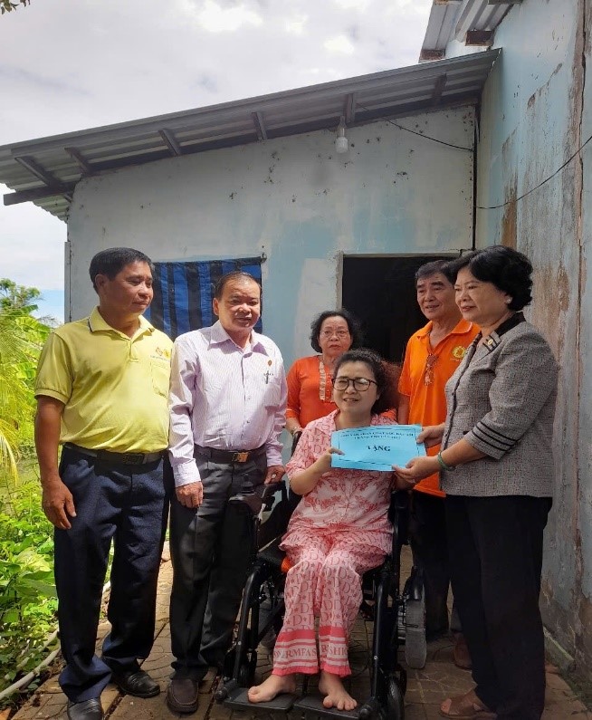 Bà Võ Thị Thanh Nga, Chủ tịch Thành hội, cán bộ Ban Giám đốc Quỹ và chính quyền địa phương đến gia đình thăm và trao tặng xe lăn cho nạn nhân