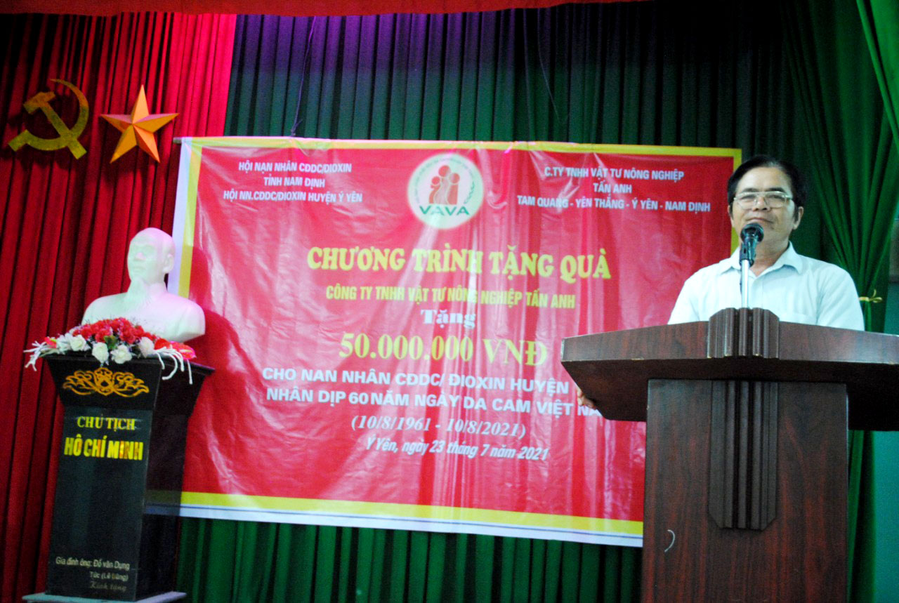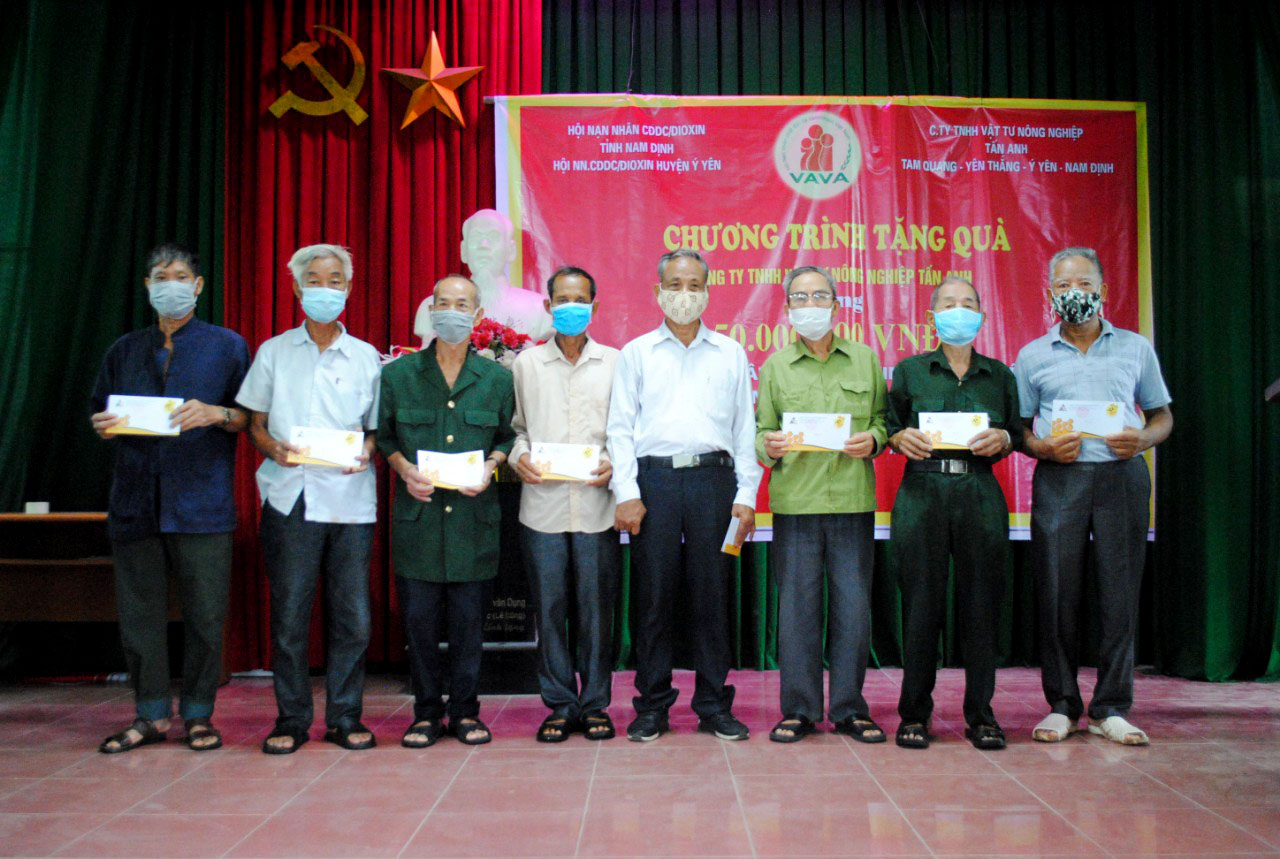 Nhân dịp kỷ niệm 60 năm Thảm họa da cam ở Việt Nam (10/8/2961 – 10/8/2021), 12 năm ngày Thành lập Hội NNCĐDC/dioxin huyện Ý Yên (16/7/2009 – 16/7/2021), Hội NNCĐDC/dioxin huyện đã vận động Công ty TNHH Vật tư nông nghiệp Tấn Anh (thôn Tam Quang, xã Yên Thắng, huyện Ý Yên) ủng hộ 50 triệu đồng, để tặng quà cho 100 NNCĐDC có hoàn cảnh khó khăn thuộc 3 xã: Yên Thắng, Yên Đồng và Yên Trị, mỗi suất quà là 500 nghìn đồng tiền mặt. Món quà đến với NNCĐDC đã thể hiện truyền thống đạo lý tốt đẹp của dân tộc Việt Nam “Uống nước nhớ nguồn”, “Ăn quả nhớ người trồng cây” thể hiện sự tri ân đối với những người đã hy sinh, cống hiến vì nền độc lập tự do vì hạnh phúc của nhân dân; món quà cũng phần nào kịp thời chia sẻ, động viên NNCĐDC vượt lên nỗi đau da cam./.