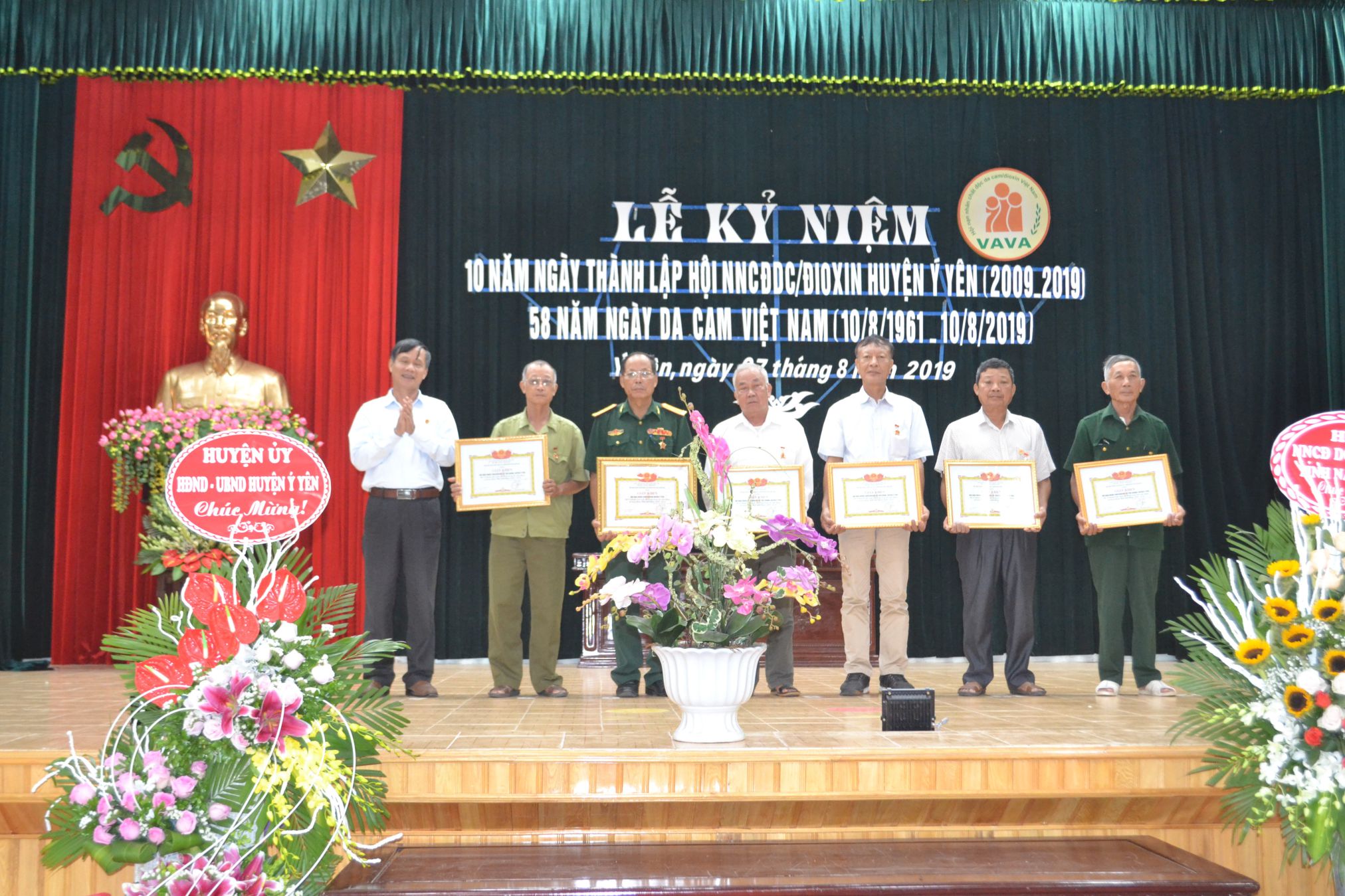 Ghi nhận thành tích xuất sắc đó, nhân dịp Kỷ niệm 10 năm ngày Thành lập Hội NNCĐC/dioxin Huyện Ý Yên và 58 năm Thảm họa chất độc da cam ở Việt Nam và ngày Vì NNCĐDC - 10/8, Trung ương Hội NNCĐDC/dioxin Việt Nam đã trao tặng Kỷ niệm chương “Vì NNCĐDC” cho 37 cá nhân; Tỉnh hội tặng Giấy khen cho 6 hội cơ sở của huyện có thành tích xuất sắc trong hoạt động công tác hội giai đoạn 2009 – 2019. Kết quả hoạt động trong 10 năm qua của Hội còn được cấp ủy, chính quyền và nhân dân trong huyện ghi nhận, đánh giá cao.