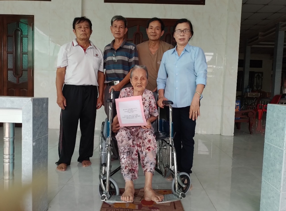 Bà Lê Thị Thu Hồng (thứ nhất, bên phải), Chủ tịch Hội tỉnh Long An tặng xe lăn tại nhà cho bà Trương Thị Kỹ, 94 tuổi, ở khu phố Bình Quân 2- Phường 4, thành phố Tân An.