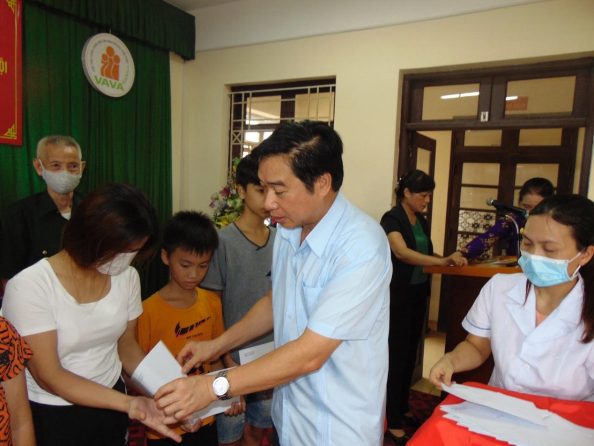 | Ông Nguyễn Văn Giang - Ủy viên Ban Thường vụ Tỉnh ủy, Trưởng ban Dân vận Tỉnh ủy Thái Bình trao quà cho nạn nhân chất độc da cam |