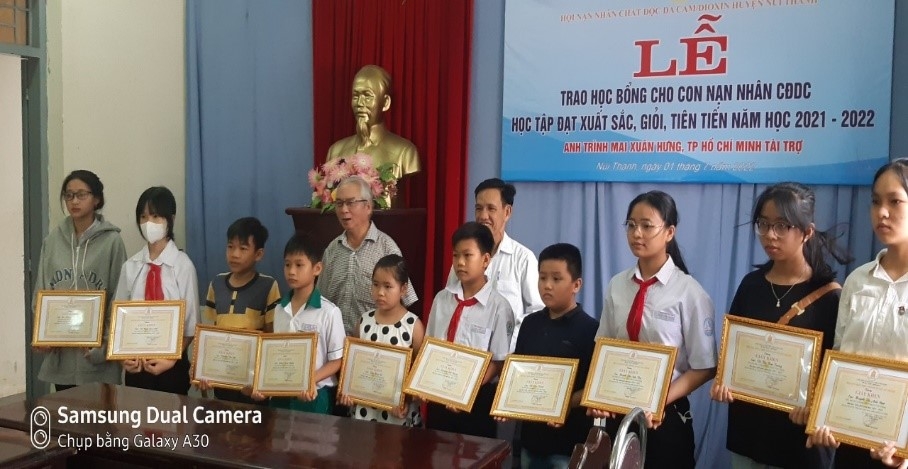 Tại Hội Nạn nhân chất độc da cam/dioxin, Huyện hội tổ chức Lễ trao học bổng cho các con của nạn nhân chất độc da cam vượt khó học tập đạt thành tích cao trong năm học 2021-2022. Trong 20 em là học sinh phổ thông thì có 3 em đạt loại xuất sắc, 4 em đạt loại giỏi, 4 em đạt loại tiên tiến; phần thưởng tặng các em là giấy khen, kèm theo 1 triệu đồng cho mỗi em đạt loại xuất sắc và giỏi, do anh Trình Mai Xuân Hưng, Thành phố Hồ Chí Minh tặng; kèm theo 500.000đồng cho mỗi em đạt loại tiên tiến, do Huyện hội Núi Thành tặng; Tổng tiền thưởng là 9.000.000đ.