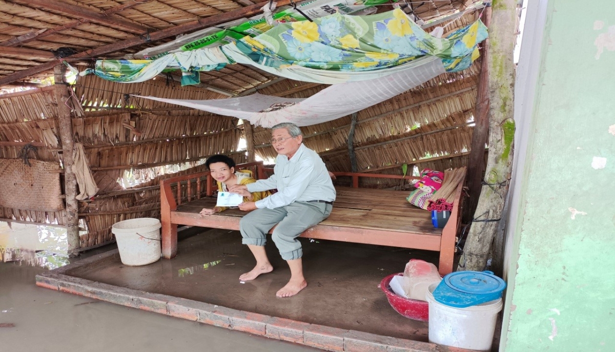 Đoàn đã đến thăm hỏi, động viên gia đình nạn nhân Thạch Vui Đạt, sinh năm 1965, ấp Phước Thọ B, xã Mỹ Phước, huyện Mỹ Tú, 2 chú bị liệt nằm 1 chỗ, hơn 10 năm không rõ nguyên nhân, do gia đình không có tiền khám điều trị, vợ chú là cô Nguyễn Thị Vàng, sinh năm 1978 bị tâm thần nhẹ, động kinh, con gái Thạch Bích Ngọc, sinh năm 2008, bị hở môi, vẹo cột sống. Gia đình rất khó khăn, nguồn thu nhập chính là cô Vàng, ai thuê gì làm đó, không có đất sản xuất.