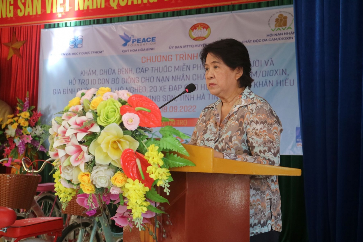 Phát biểu tại Chương trình, bà Trần Thị Dung cho biết: Quỹ Hoa Hòa Bình tiền thân là Quỹ Hòa Bình Mỹ Lai được thành lập nhằm mục đích hỗ trợ, khuyến khích, phát triển văn hóa – giáo dục, hàn gắn vết thương chiến tranh và các mục tiêu phát triển cộng đồng khác không vì mục đích lợi nhuận. Với tinh thần chia sẻ, Quỹ Hoa Hòa Bình và Bệnh viện Đại học Y dược TP Hồ Chí Minh trân trọng mang đến những gia đình nghèo và các hộ NNCĐDC những món quà ý nghĩa giúp họ vượt qua khó khăn, vươn lên làm chủ cuộc sống. Nhân đây, bà Trần Thị Dung cũng gửi lời cảm ơn đến cấp ủy, chính quyền, Ủy ban MTTQ tỉnh Hà Tĩnh và huyện Hương Sơn phối hợp, tạo mọi điều kiện thuận lợi nhất để đoàn công tác thực hiện được mục đích, ý nghĩa nhân văn – vì cộng đồng của Chương trình.