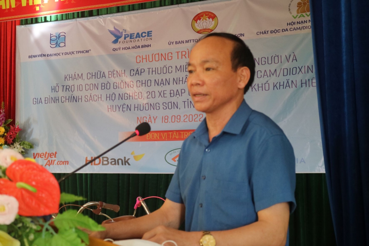Ông Nguyễn Viết Dũng, Phó Bí thư Thường trực Huyện ủy chia sẻ: Hương Sơn là huyện biên giới có nhiều thuận lợi, nhưng vẫn còn nhiều khó khăn do thiên tai. Trong 10 năm tập trung xây dựng nông thôn mới, Hương Sơn đã đạt được thành tích khá toàn diện. Tuy nhiên, toàn huyện vẫn còn 4,8% hộ nghèo, đặc biệt còn những hộ đặc biệt khó khăn. Thay mặt cấp ủy, chính quyền, nhân dân huyện Hương Sơn, ông Nguyễn Viết Dũng cũng gửi lời cảm ơn chân thành đến các nhà tài trợ đã có những hoạt động nhân đạo thiết thực vì cộng đồng đối với nhân dân huyện Hương Sơn nói chung và nạn nhân chất độc da cam nói riêng.