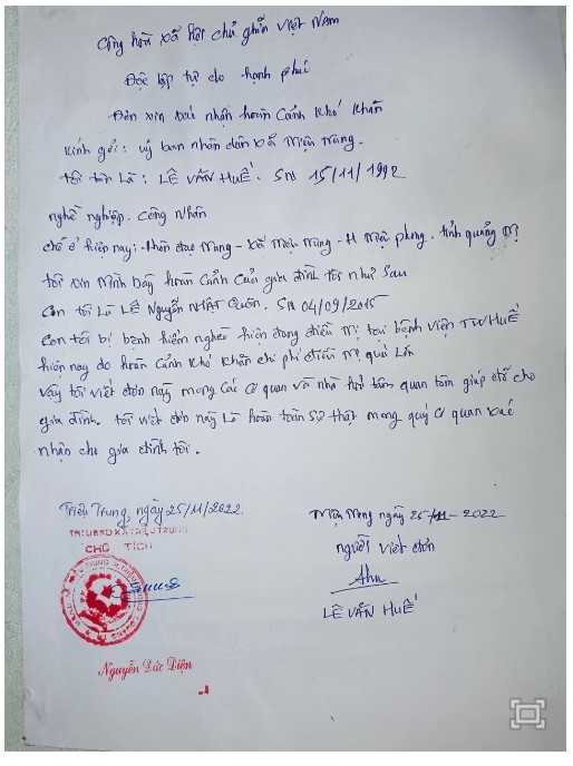 Ngồi dưới hiên nhà nhỏ viết đơn xác nhận hoàn cảnh khó khăn với hy vọng các cấp chính quyền, nhà hảo tâm thấu hiểu hoàn cảnh, chia sẻ, giúp đỡ cho con trai có thêm cơ hội điều trị căn bệnh hiểm nghèo, anh Lê Văn Huế (30 tuổi, thôn Đạo Trung, xã Triệu Trung, huyện Triệu Phong, tỉnh Quảng Trị) gạt nước mắt nhắc lại cuộc đời bất hạnh của mình.