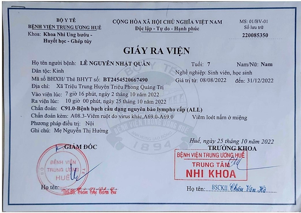 Lúc đầu con tôi được chẩn đoán bị viêm khớp nhưng nằm tại bệnh viện tuyến huyện, tuyến tỉnh điều trị không đỡ. Khi bệnh ngày càng nặng, con được chuyển lên bệnh viện Trung ương Huế thì được kết luận bị ung thư máu.