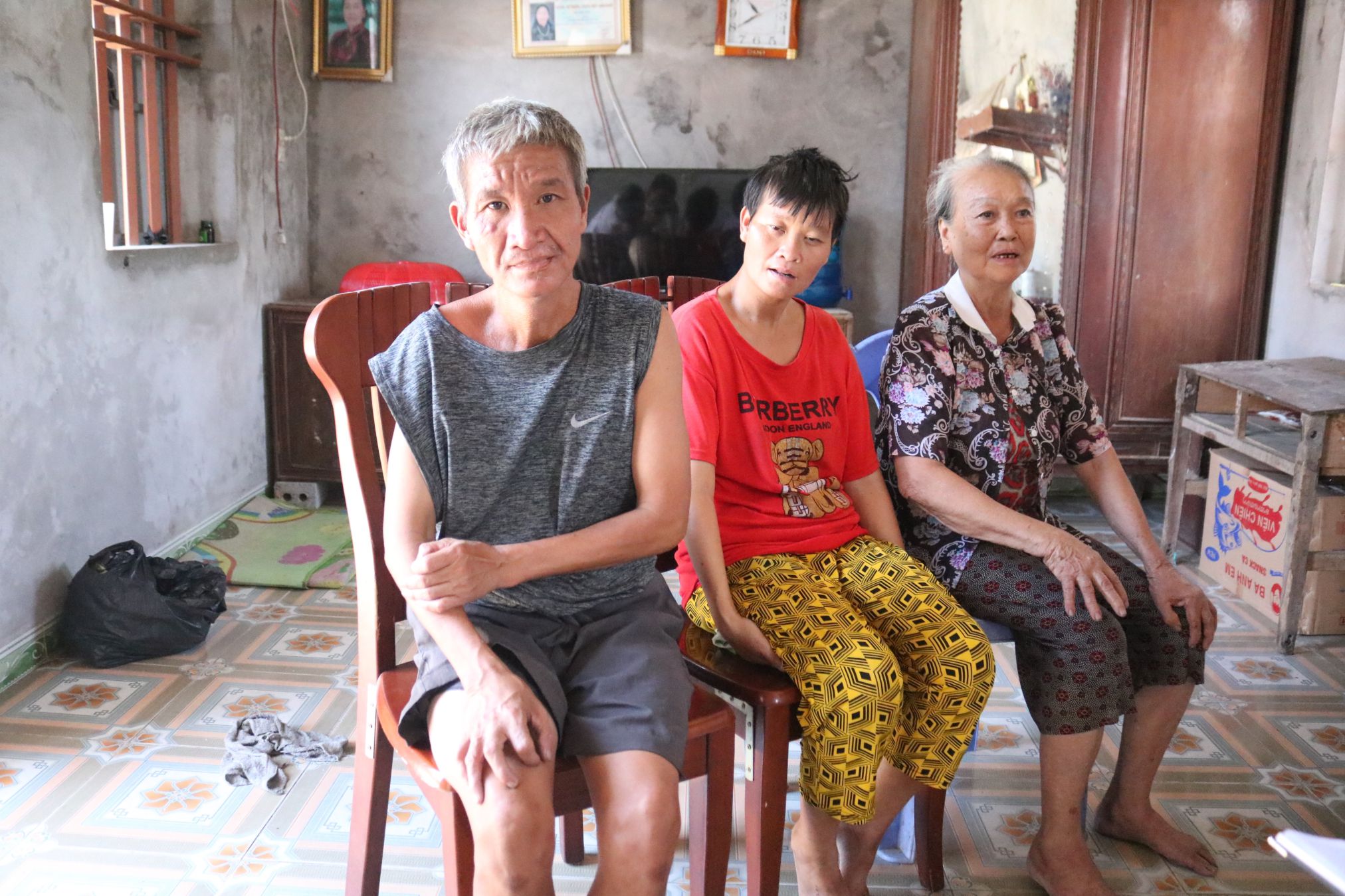 Bà Bùi Thị Mậu bên cạnh 2 người con ngây ngây, dại dại.