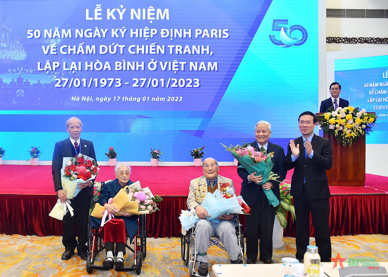 | Đồng chí Võ Văn Thưởng tặng hoa các thành viên đoàn đàm phán dự lễ kỷ niệm 50 năm Ngày ký Hiệp định Paris. Ảnh: Bình Nguyên |