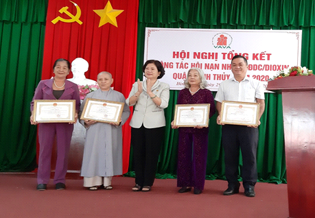 Má không chịu kể về thành tích của mình, càng không muốn được đề nghị khen thưởng, nhưng qua nắm tình hình hoạt động của Hội, và nghe má kể về những kỷ niệm khi đi làm từ thiện, tôi biết được má đã nhận chăm sóc và hỗ trợ học phí cho 1 trẻ mồ côi (sống với ông nội là NNCĐDC) suốt từ năm học lớp 6 lên đại học, hỗ trợ sửa chữa 3 căn nhà, mua tặng 4 xe đạp và 2 xe lăn cho 6 nạn nhân bị khuyết tật, hỗ trợ gần 20 triệu đồng cho nạn nhân điều trị tại bệnh viện và má đã mua hỗ trợ 2 quan tài mai táng cho nạn nhân qua đời. Đặc biệt từ 2014 đến nay, trong các dịp lễ, tết má đều có từ 200 đến 250 phần phần quà và mỗi tháng 100 kg gạo tài trợ cho nhà nuôi dưỡng người già.