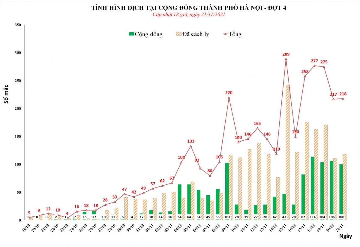Theo báo cáo của Sở Y tế Hà Nội, 218 F0 mới phân bố tại 25/30 quận, huyện là Nam Từ Liêm, Hai Bà Trưng (25); Quốc Oai (22); Hoàng Mai (14); Đống Đa (13); Gai Lâm (13); Chương Mỹ, Mỹ Đức (11); Hà Đông (10), Thanh Xuân (9); Sơn Tây (8), Đông Anh, Hoài Đức (7); Thanh Trì, Ba Đình (6); Phú Xuyên, Bắc Từ Liêm, Long Biên (5); Mê Linh (4), Thường Tín, Cầu Giấy, Thanh Oai (3), Tây Hồ, Hoàn Kiếm, Thạch Thất (1).