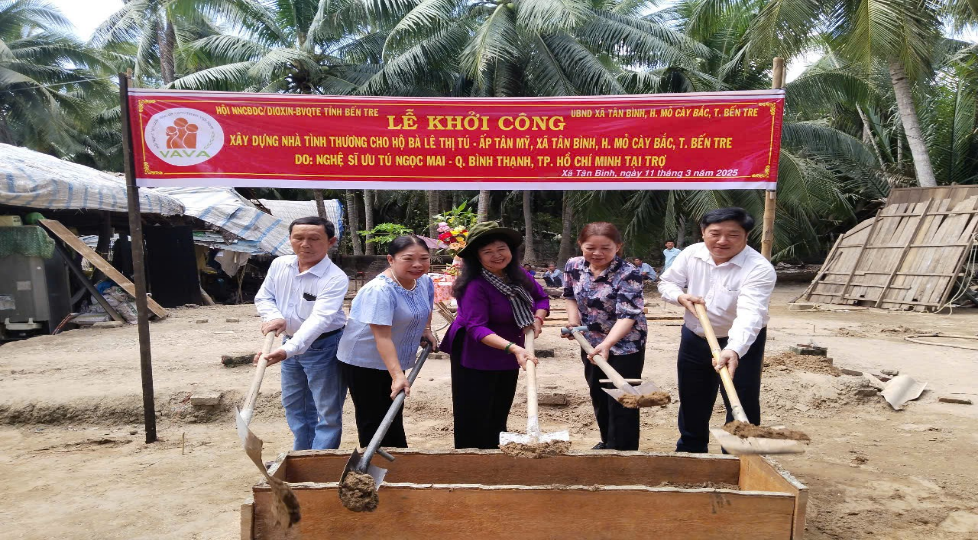 Hưởng ứng Phong trào xây dựng xóa nhà tạm, nhà dột nát của Ban chỉ đạo tỉnh và Ủy ban MTTQ tỉnh Bến Tre. Vận động nguồn lực chung tay xóa nhà tạm, nhà dột nát, ngày 11/3/2025, Hội NNCĐDC/dioxin - BVQTE tỉnh phối hợp với UBND xã Tân Bình, huyện Mỏ Cày Bắc tổ chức lễ khởi công xây dựng Nhà tình thương cho gia đình bà Lê Thị Tú, sinh 1934 ở ấp Tân Mỹ, xã Tân Bình, huyện Mỏ Cày Bắc có hoàn cảnh khó khăn về nhà ở.