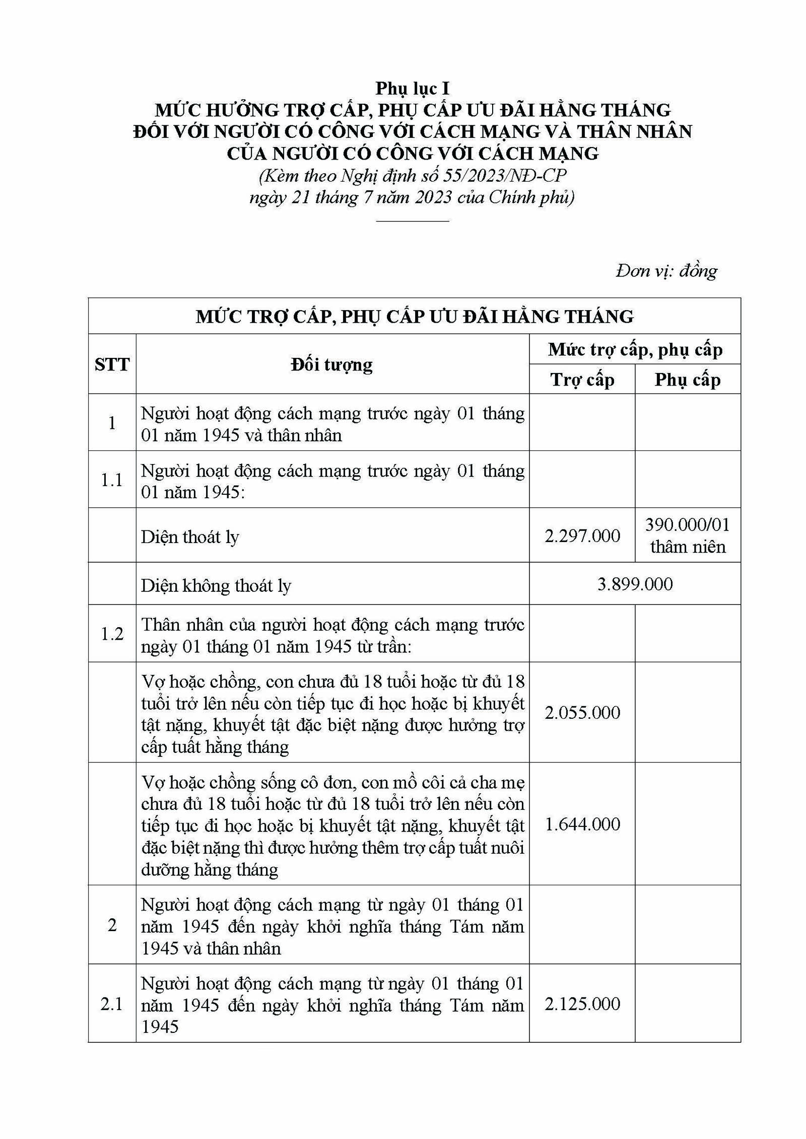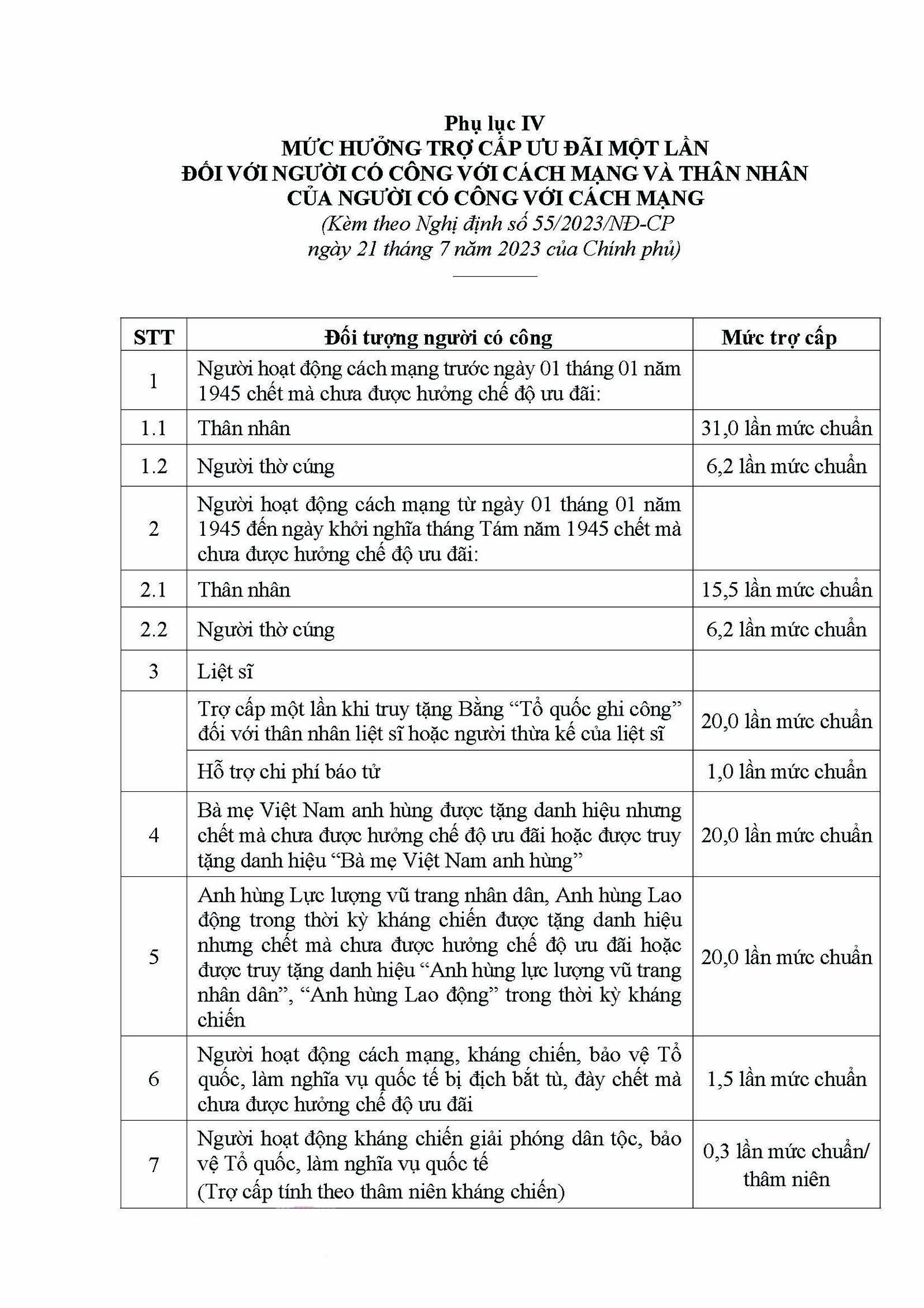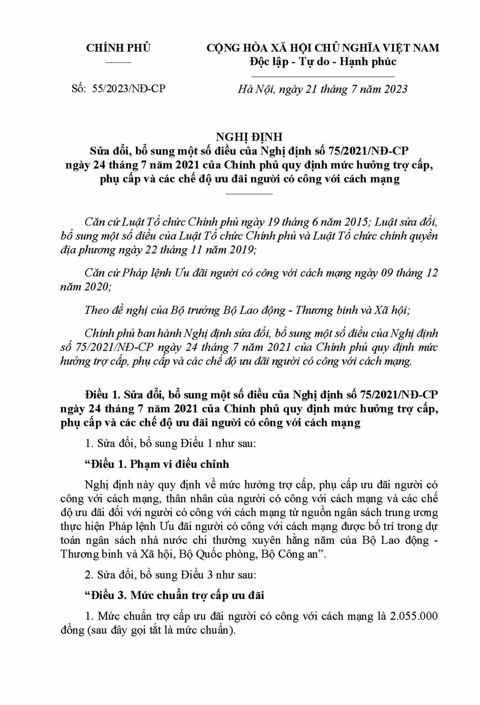 Nghị định 55/2023/NĐ-CP ngày 21/7/2023 của Chính phủ về sửa đổi, bổ sung một số điều của Nghị định 75/2021/NĐ-CP ngày 24/7/2021 của Chính phủ quy định mức hưởng trợ cấp, phụ cấp và các chế độ ưu đãi người có công với cách mạng