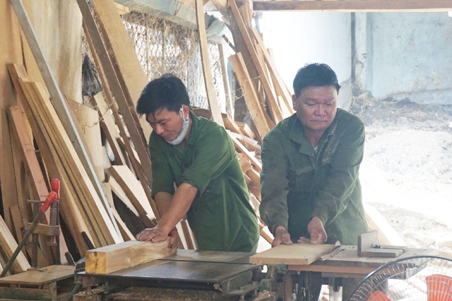 Ông Cảnh cùng người con trai thứ 3 bị tàn tật ở chân là lao động chính trong xưởng gỗ của gia đình