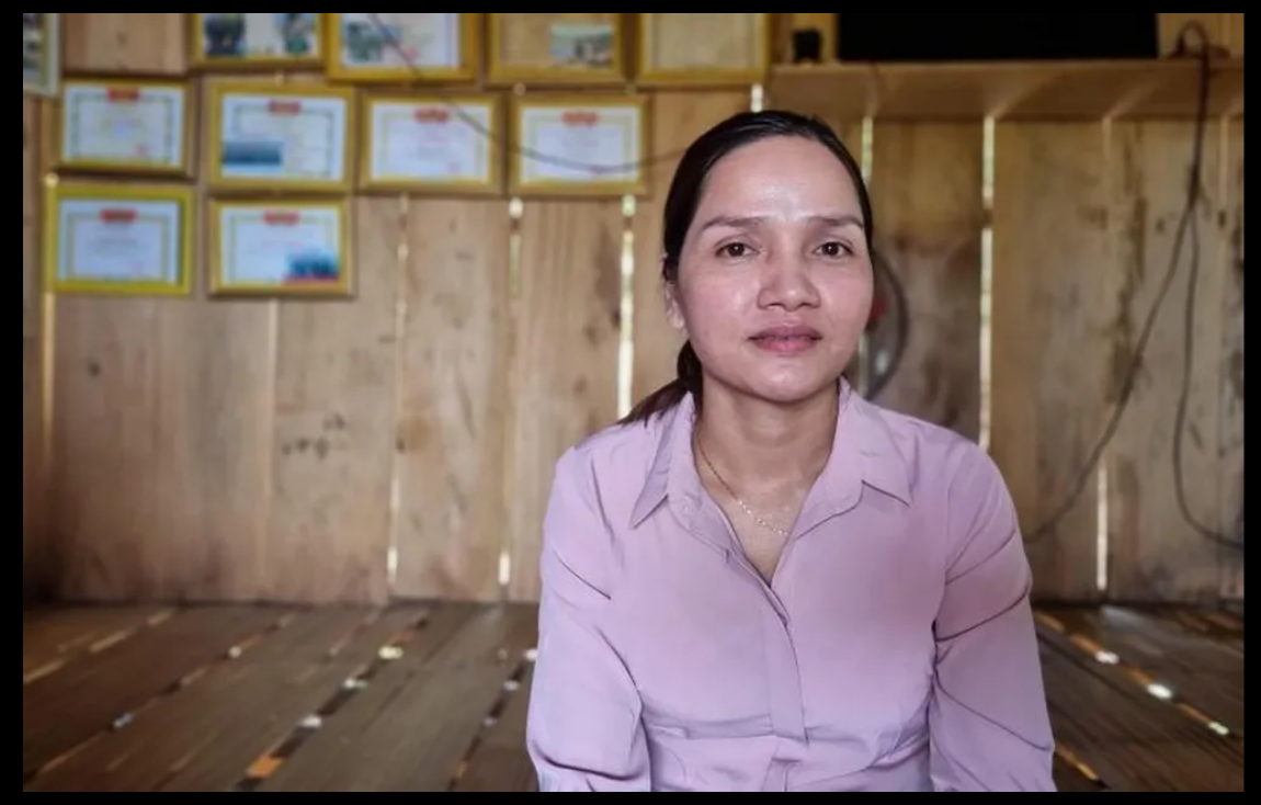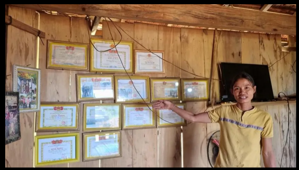 | Chị Đinh Thị Nhiêu - một hộ gia đình tiêu biểu ở Đắk Pao, đứng cạnh vách tường treo đầy tấm giấy khen của các con. |