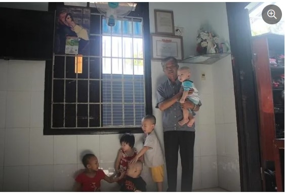 | Ông Tống Phước Phúc bên những đứa trẻ bị bỏ rơi ông đã nhận về nuôi từ lọt lòng. |