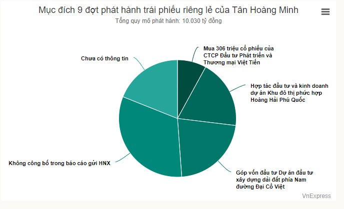 Về mục đích, toàn bộ các đợt phát hành đều được sử dụng để đầu tư chéo vào các công ty thành viên khác trong hệ sinh thái Tân Hoàng Minh, thay vì huy động vốn cho công ty trực tiếp chào bán trái phiếu. Có những đợt phát hành còn dùng để mua cổ phần từ chính Chủ tịch Tân Hoàng Minh và người thân.