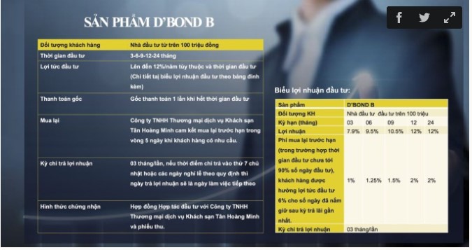 Lời mời chào mua trái phiếu của Tân Hoàng Minh xuất hiện trên nhiều hội nhóm, mạng xã hội. Một số nhà đầu tư cá nhân cho biết, nhân viên tư vấn nói rằng, chỉ với số tiền từ 100 triệu đồng trở lên, bất kỳ ai cũng có thể mua trái phiếu phát hành riêng lẻ. Người mua sẽ tham gia hợp đồng gọi là "Hợp tác đầu tư với Công ty TNHH Thương mại Dịch vụ Khách sạn Tân Hoàng Minh", cũng chính là trái chủ những đợt phát hành hàng nghìn tỷ đồng. Lãi suất được đảm bảo ở mức 12% trong điều kiện đầu tư 24 tháng.
