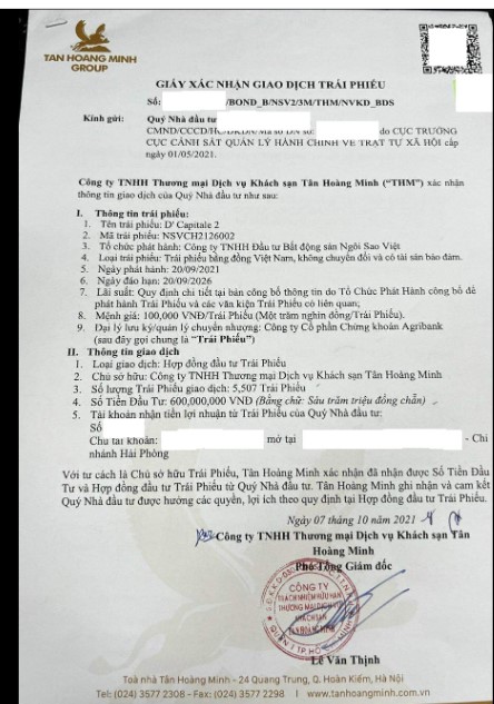 Một "giấy xác nhận đầu tư trái phiếu" của Tân Hoàng Minh với khách hàng. Ảnh nhân vật cung cấp