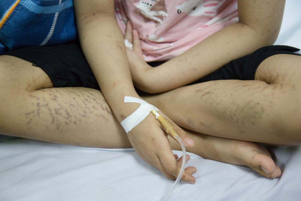Nhìn cô bé mới 11 tuổi mà trên cơ thể đầy những vết xuất huyết bầm tím, trên mũi vẫn còn chiếc gạc cầm máu, BS. Trần Quỳnh Mai, bác sĩ điều trị cho cháu tại Khoa Bệnh máu trẻ em không khỏi chạnh lòng: “Khi cháu nhập viện tiểu cầu chỉ còn dưới 10 G/l. Tình trạng xuất huyết rất nặng còn dẫn đến thiếu máu khiến cháu mệt mỏi, không đủ máu nuôi dưỡng cơ thể. Chúng tôi đã điều trị tích cực và xin dự trù khối tiểu cầu, khối hồng cầu gấp cho cháu.